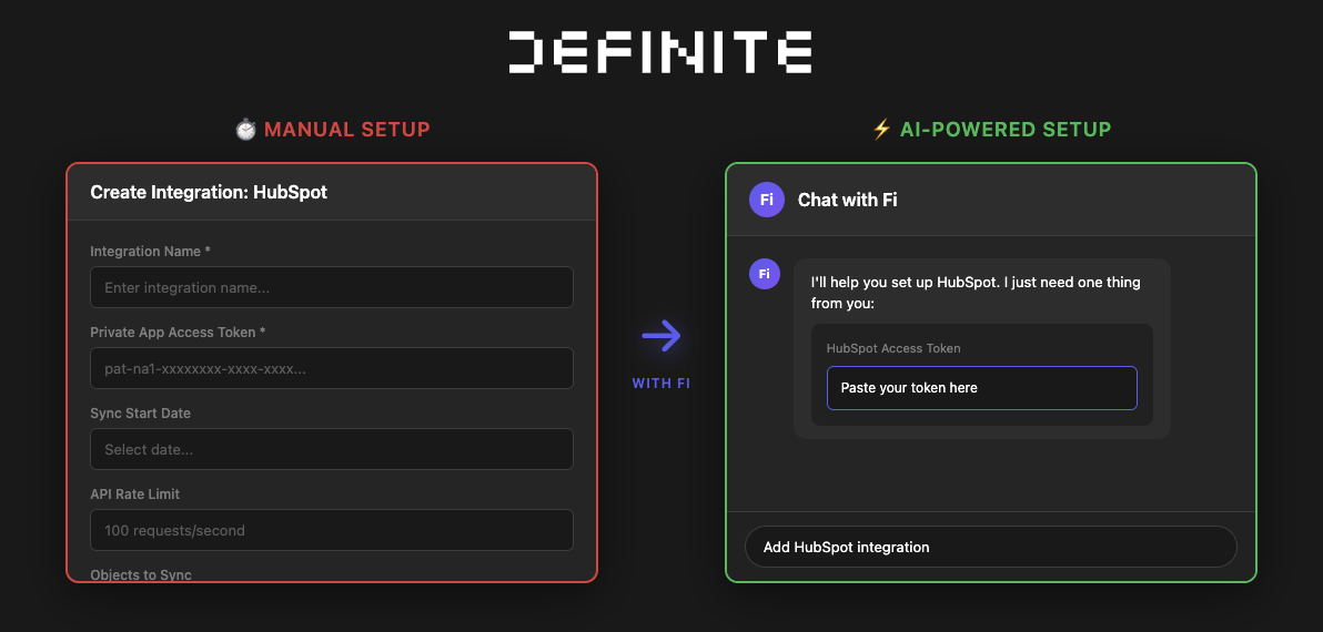 Connect HubSpot to your data warehouse in under 2 minutes. Just ask Fi.